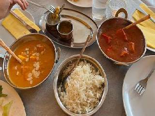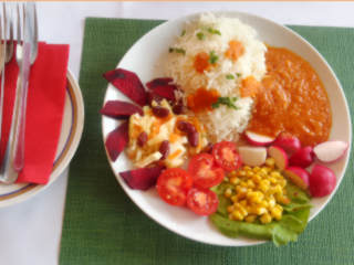 • Chicken Korma, Hühner Fleisch in einer milden Sahnesauce, Rahm Käse, Mandeln, Rosinen, Cashew, Nüssen